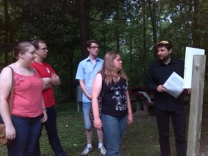 NORDHEIM (red). Auf den Spuren römischer und mittelalterlicher Geschichte wandelten die Jusos Ried am vergangenen Samstagnachmittag im Steiner Wald bei Biblis-Nordheim im Rahmen ihrer diesjährigen Sommertour. Rüdiger Glaser vom Heimat- und Geschichtsverein Nordheim führte die jungen Erwachsenen der SPD-Nachwuchsorganisation von der Gaststätte „Zur Rheinfähre“ entlang des Flusses bis hin zu den Ruinen der Burg Stein. Dort, wo bereits die Römer siedelten, trafen die Jusos auf Ewald Gleich, der es sich als Vorsitzender des Bibliser Sozialdemokraten nicht nehmen ließ, die Gruppe in Empfang zu nehmen.